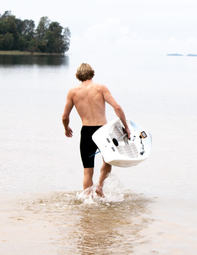 3. Form Drag, we have added deep central channels in the board to create stability when the rider becomes unbalanced and tips the board by accident. This means that the board can be ridden at a smaller width than they would normally use and therefore reduces the form shape pushing through the water.